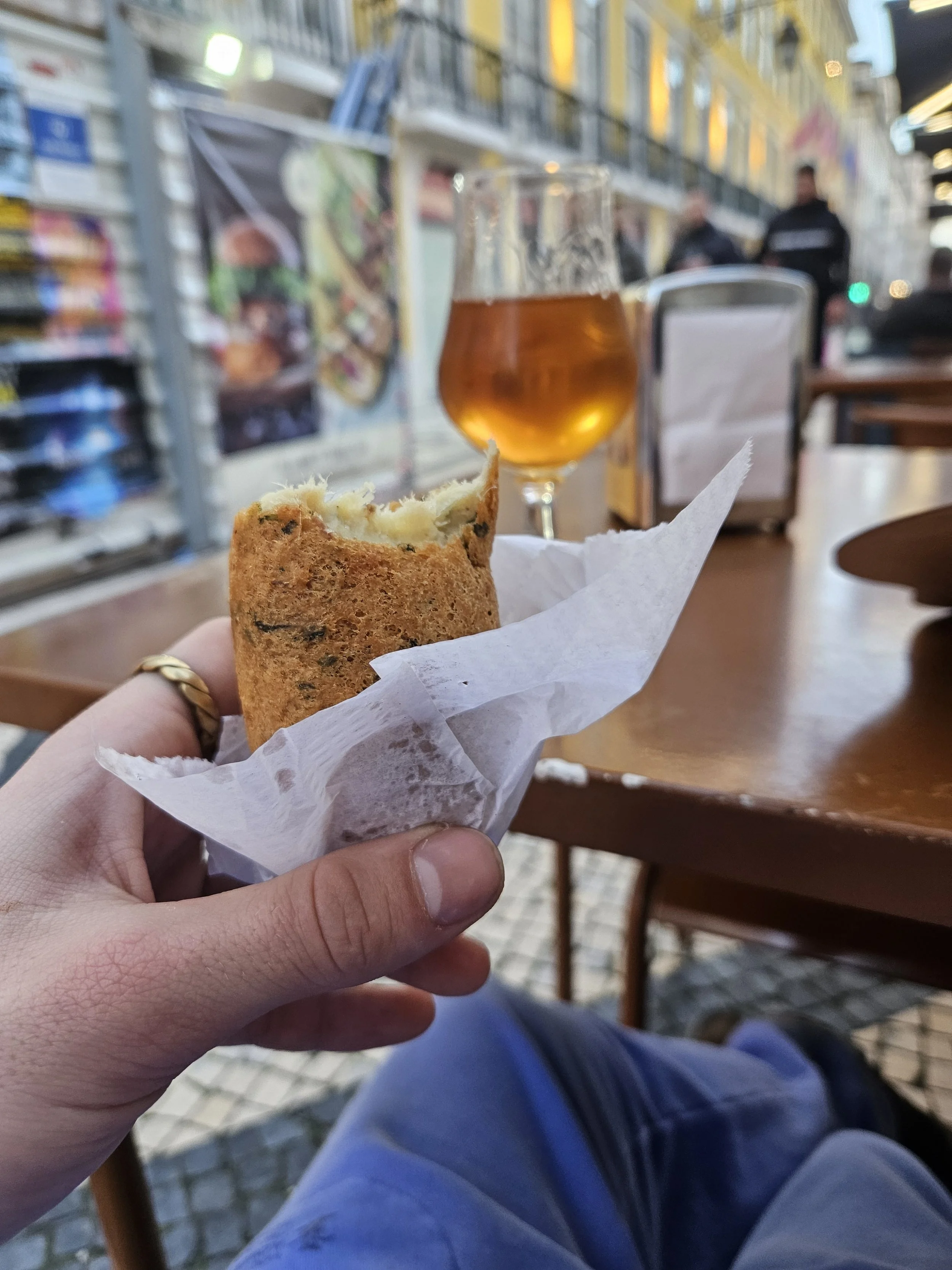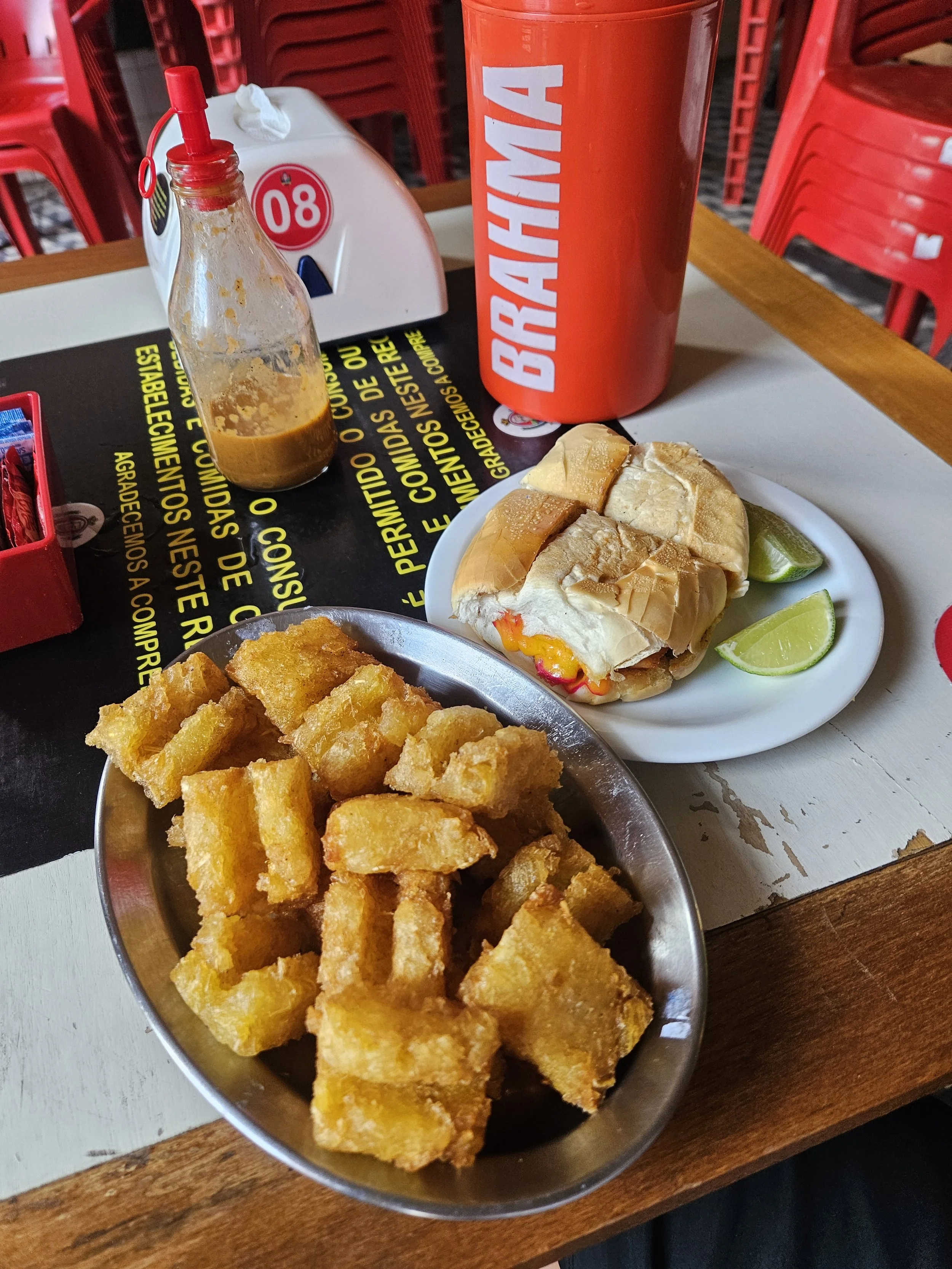 Letztendlich handelt es sich um einen warmen Bananenbrei, der ähnlich wie Milchreis zubereitet wird. Sehr lecker! Da das aber keine wirkliche Mahlzeit darstellt…nunja, es trieb mich wiedermals zur Bar do Amando. Hier bestellte ich mir ein eiskaltes Patagonia in der klassischen 750ml Flasche. Dazu gab es ein Perníl-Sandwich, das mit Limette angereicht wurde und ein paar tater tots aus Maniok. wirklich sehr sehr gut! Während ich das gute Wetter und meine Verpflegung genoss, freundete ich mich mit einem Straßenhändler an, der ursprünglich aus Kolumbien kommt. Endlich konnte ich mich mal wieder auf Spanisch unterhalten! Es ging um seinen Werdegang, wie seit Jahren als reisender Verkäufer durch Südamerika tourt. Er schien die Freiheit, trotz des alltäglichen Struggles zu lieben. Im gefiel, wie ich über sein Heimatland redete. Nicht viele Menschen in Kolumbien wüssten ihre Natur so zu schätzen. Ich kaufte ihm noch zwei Armbänder ab und gab ihm ein kleines Trinkgeld.