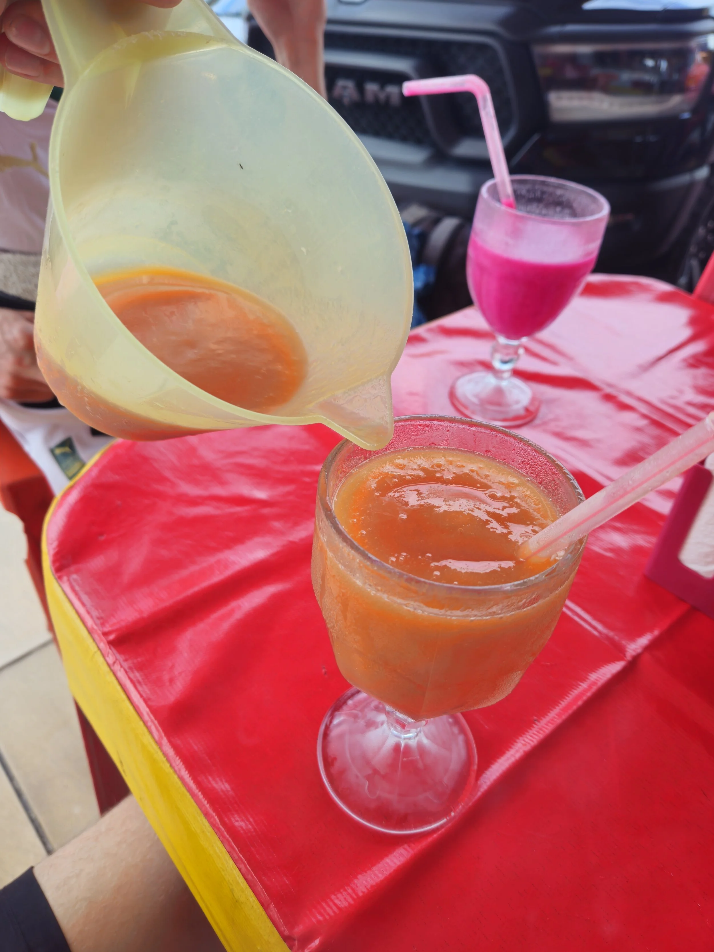 Die Saftauswahl war enorm! Wir konnten aus 30-40 verschiedenen Kombinationen wählen. Unter anderem enthielten sie Aubergine, Brotfrucht und auch Noni, die wegen ihres Geruchs auch Kotzfrucht genannt wird.